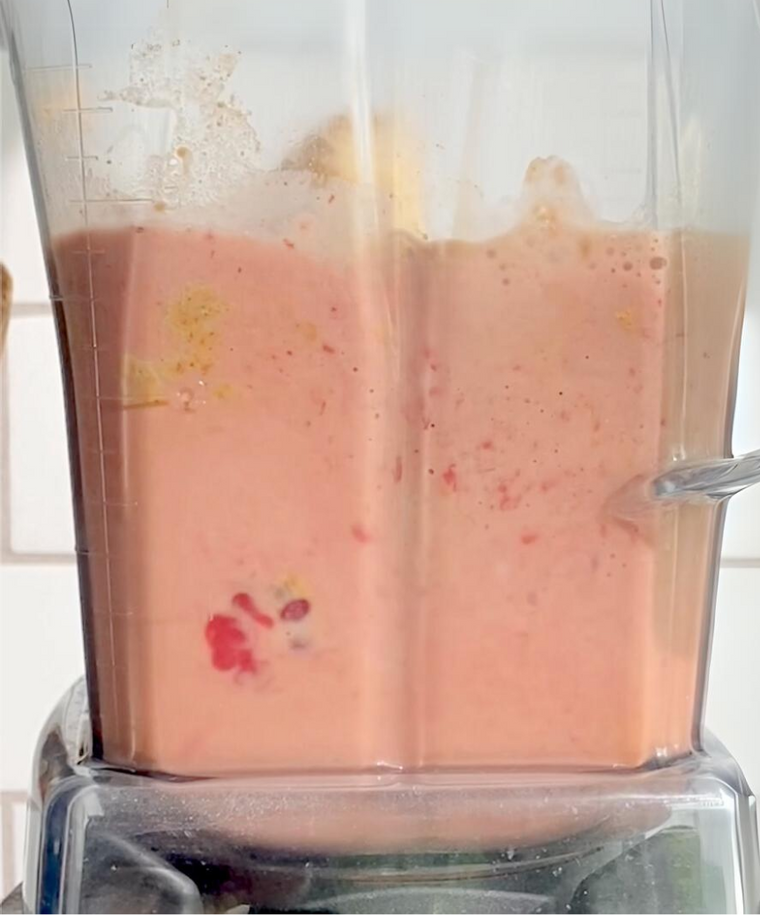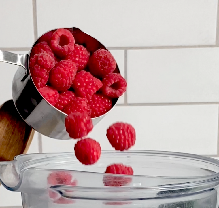 Add banana, raspberries, Peanut Butter Protein, and milk to a blender