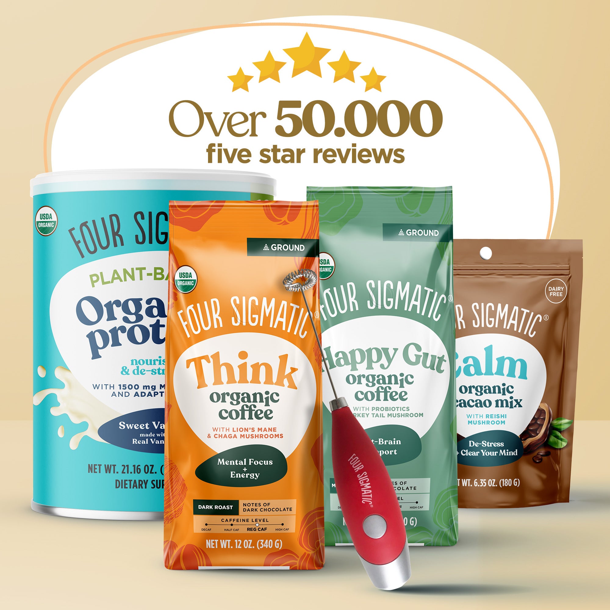 16 servings. Dark roast. Start your day with Four Sigmatic’s organic mushroom coffee, powered by the benefits of Lion’s Mane and Chaga mushrooms. Experience enhanced focus, and energy without jitters, all packed into a cup of rich and smooth coffee.