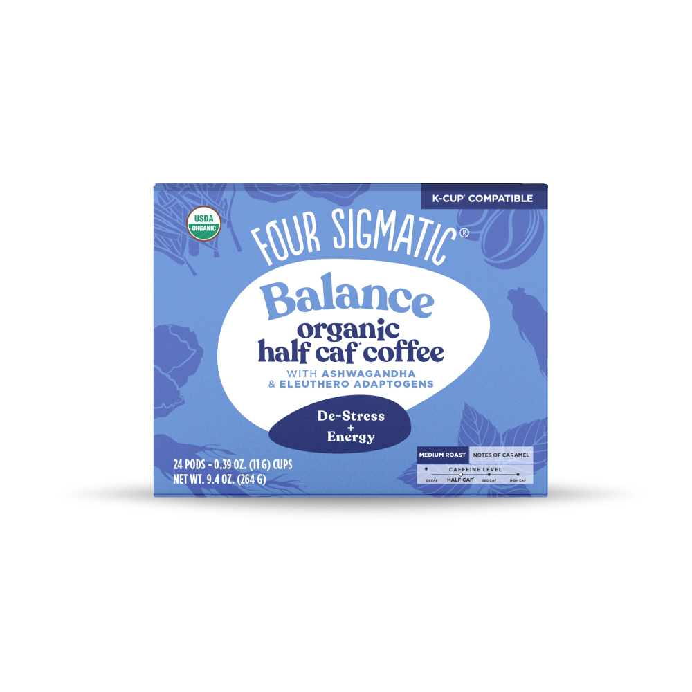 Lower caffeine, less stress in a half caf* brew. Organic coffee infused with adaptogens to help you find calm, and balance body and mind.