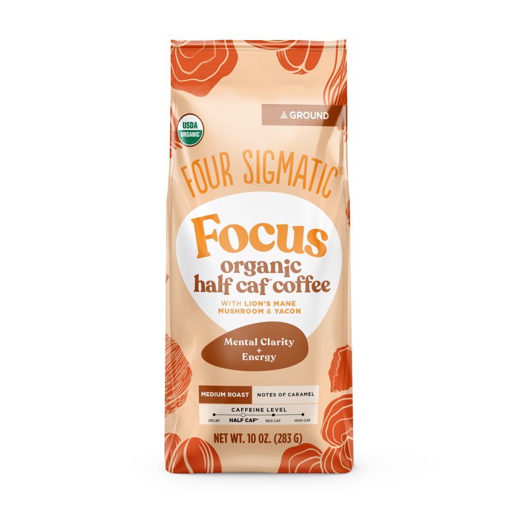 Lower caffeine, less stress in a a half caf* brew. Organic coffee infused with lion’s mane mushrooms and yacon for focus without the jitters. See results in as little as 7 days with a focus that tastes unbelievably delicious.